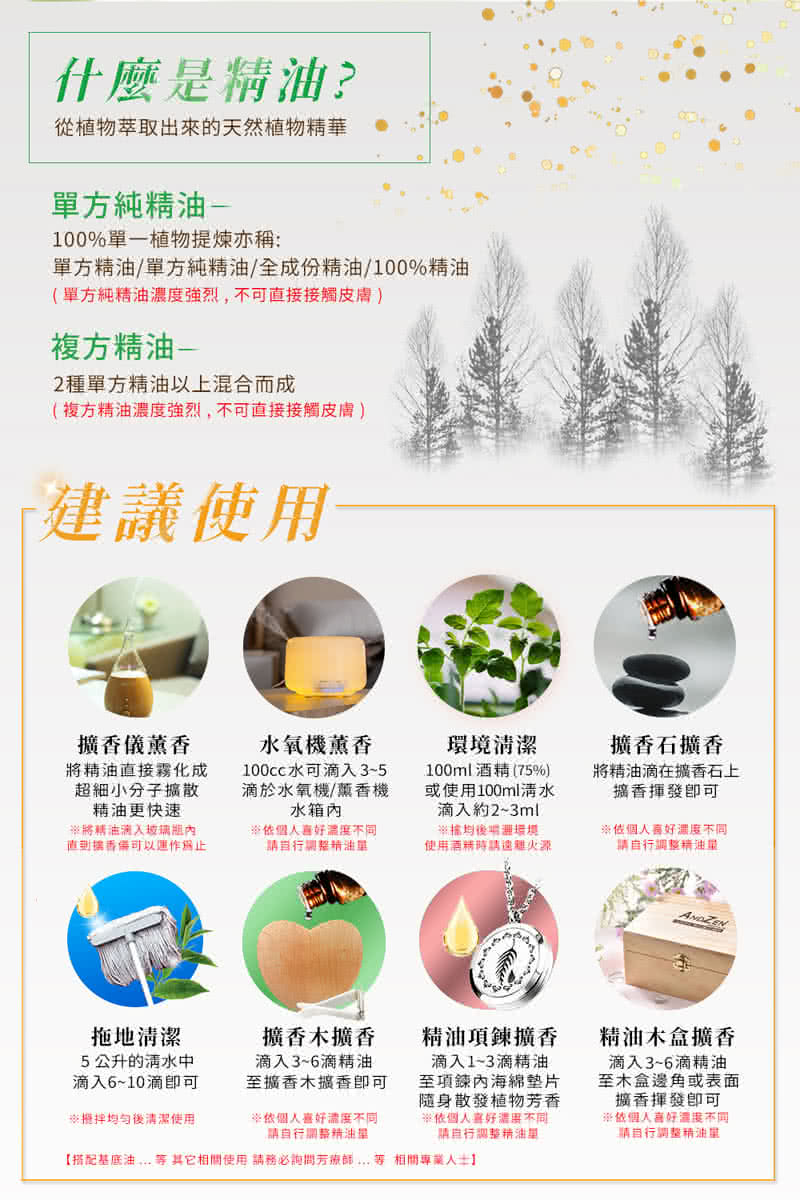 6本產品為純精油,配合香氛機使用時,建議每100CC淨水可滴入510滴,